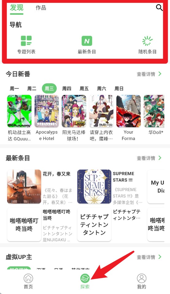 2、点击“探索”进入导航页面,可查找专题条目与最新更新内容。