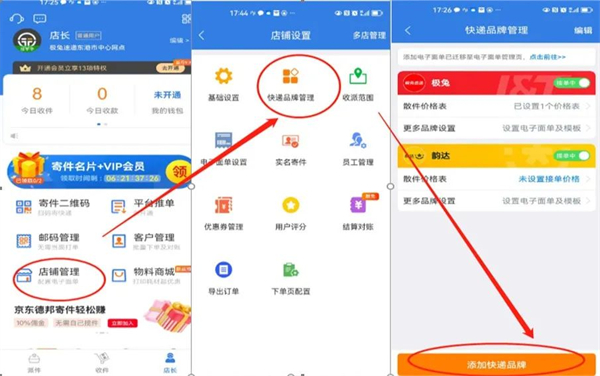 进入收件端APP,在【店长】→【店铺管理】→【快递品牌管理】,点击页面下方的“添加快递品牌”按钮,添加快递公司。
