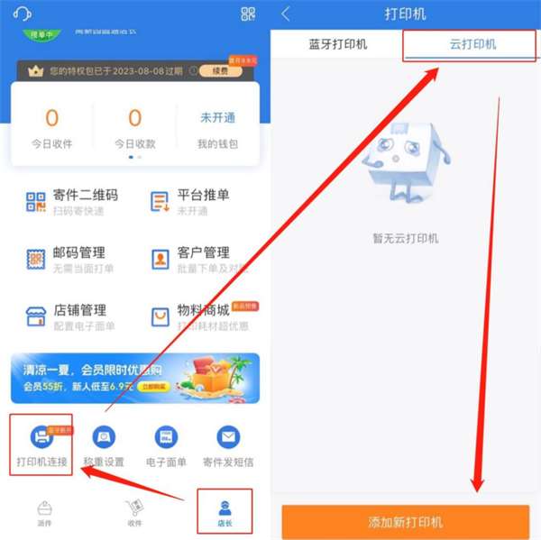 在【店长】→【打印机连接】,进入到打印机的配置页面,需要留意看连接的是蓝牙打印机还是云打印机类型,再切换到相应的页面点击下方“添加打印机”按钮配置。以下示例以添加菜鸟云打印为例: