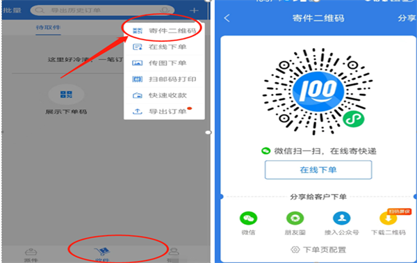 快递员小哥可以在收件端的【收件】右上角点开“+”号,选择【寄件二维码】,此时会出现寄件二维码,小哥把二维码分享给客户,客户用微信扫一扫即可进入到下单页面,填写下单信息提交。
