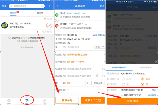 客户下单后,订单会同步到小哥的收件端【收件】页面,小哥需要做的是收件后点开订单,确认信息后“获取单号”,选择打印机、模板便可点击“开始打印”出单。