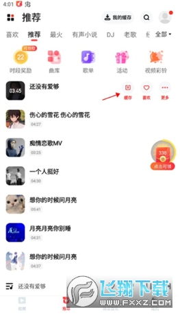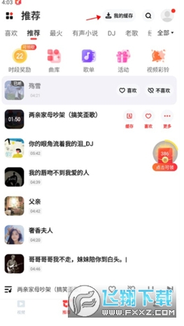 1、在本站下载好快音悦app后,打开软件,在推荐界面点击自己喜欢的歌曲,选择缓存。