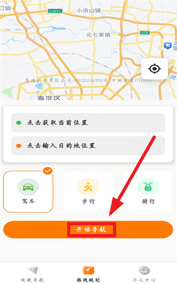 打开实时路况卫星导航app,进入后在路线规划界面选择当前位置和目的地,选择出行方式,点击开始导航