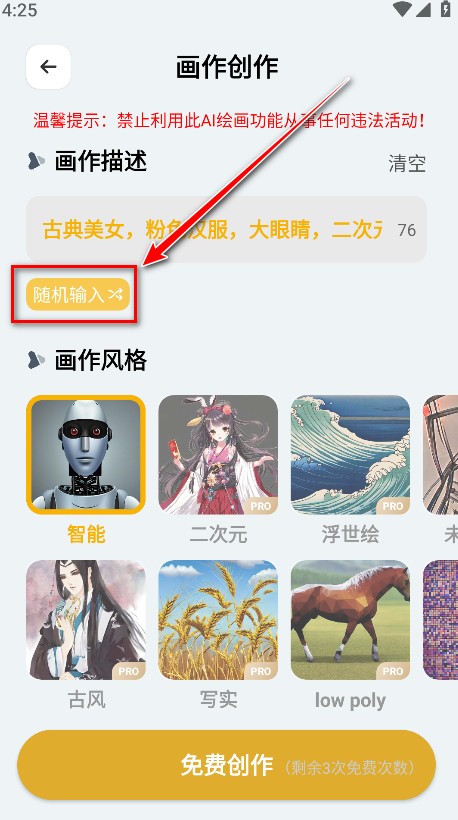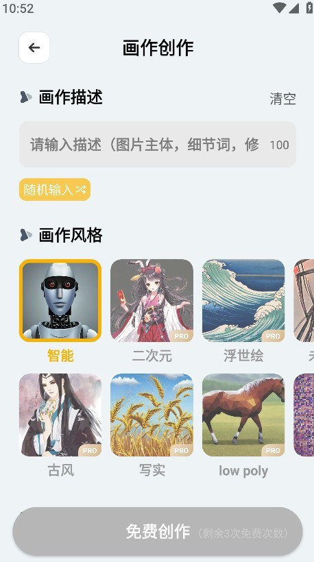 5.请输入画作描绘,自定义选择画作风格、画作数量、画作比例等等。