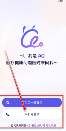 1、打开蚂蚁阿福(AQ),可以看到本软件支持支付宝一键登录或者手机号登录,在这里小编以点击手机号登录为例。