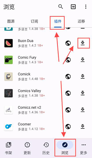 2、进入"浏览"板块,点击"插件",选择下载自己想要添加的插件。