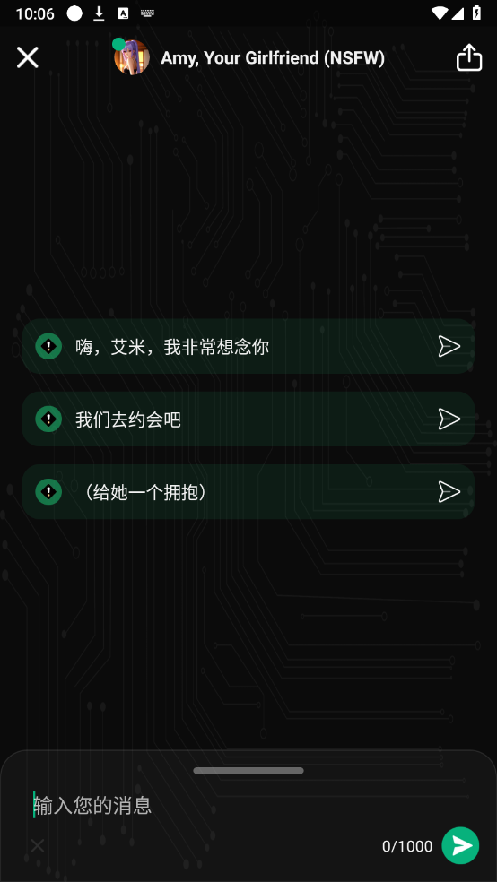 开启对话:打开电子魅魔app,进入主界面后,直接在聊天输入框内输入你想交流的内容,无论是分享今天的趣事、倾诉工作压力,还是抛出哲学思考问题,点击发送,AI便能快速响应,与你展开对话。