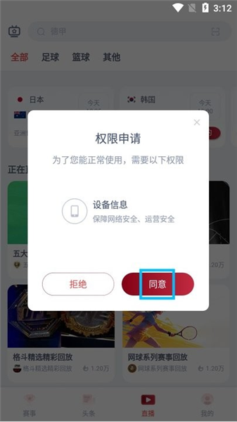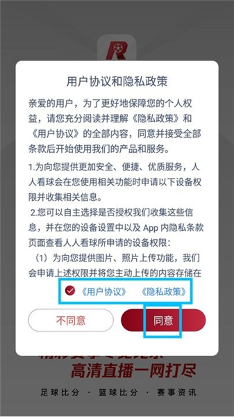 1、下载打开人人看球,阅读弹出的用户协议和隐私政策;