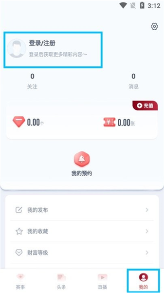 4、进入【我的】版块,点击【登录/注册】;