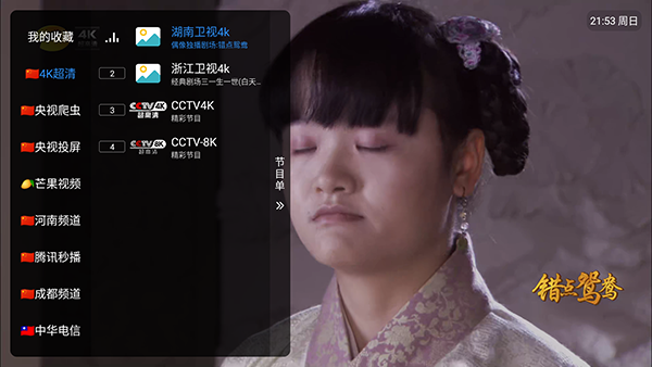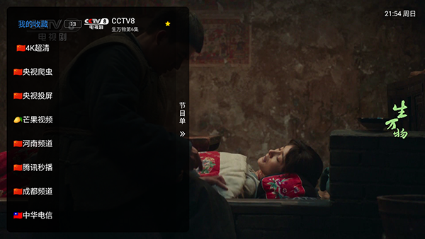 2、点击左侧屏幕可以唤起电视频道列表,电视端用户需要使用遥控器按菜单选项。