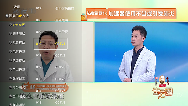 2、点击左侧屏幕可以唤起电视频道列表,电视端用户使用遥控器按菜单选项。