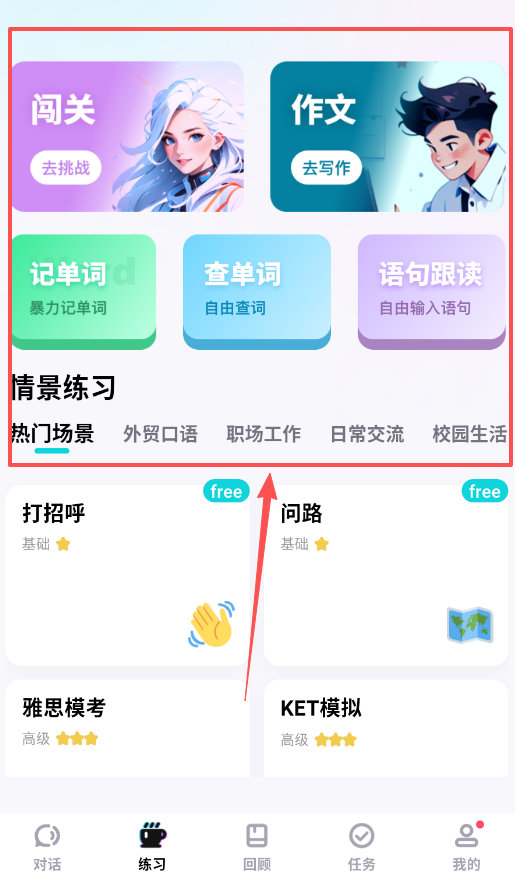 2、可以试试闯关挑战和作文写作功能,从基础打招呼到高级雅思模考都有,根据自身水平选择合适的内容慢慢练习就好。