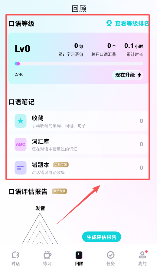 3、回顾功能能帮你追踪学习进度,在这里可以看到口语等级和累计学习数据,还能查看等级排名激励自己坚持学习呢。