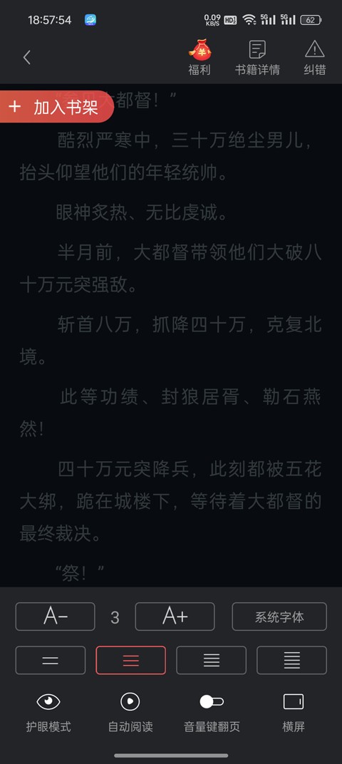 界面设计简洁清新,排版舒适,支持自定义字体、背景色(日间/夜间模式)、亮度调节;