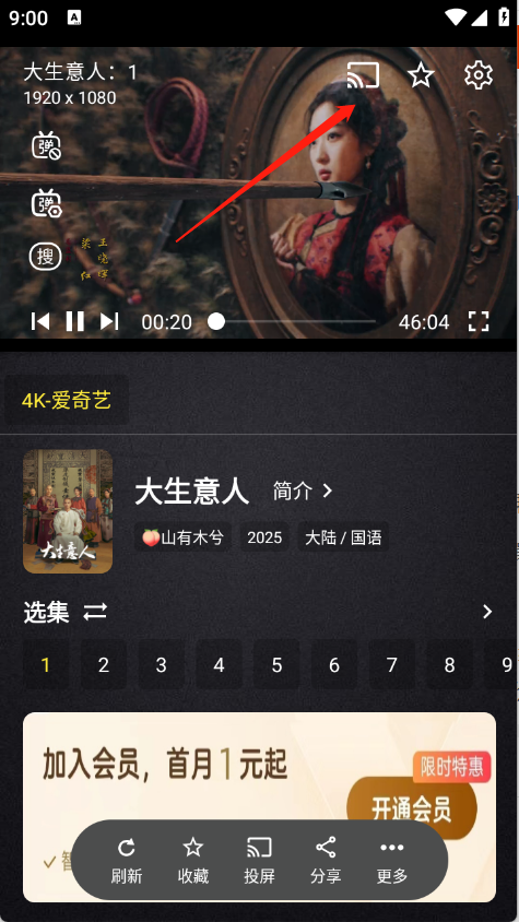 1、打开想观看的影视内容,进入播放界面后点击右上角的投屏按钮。