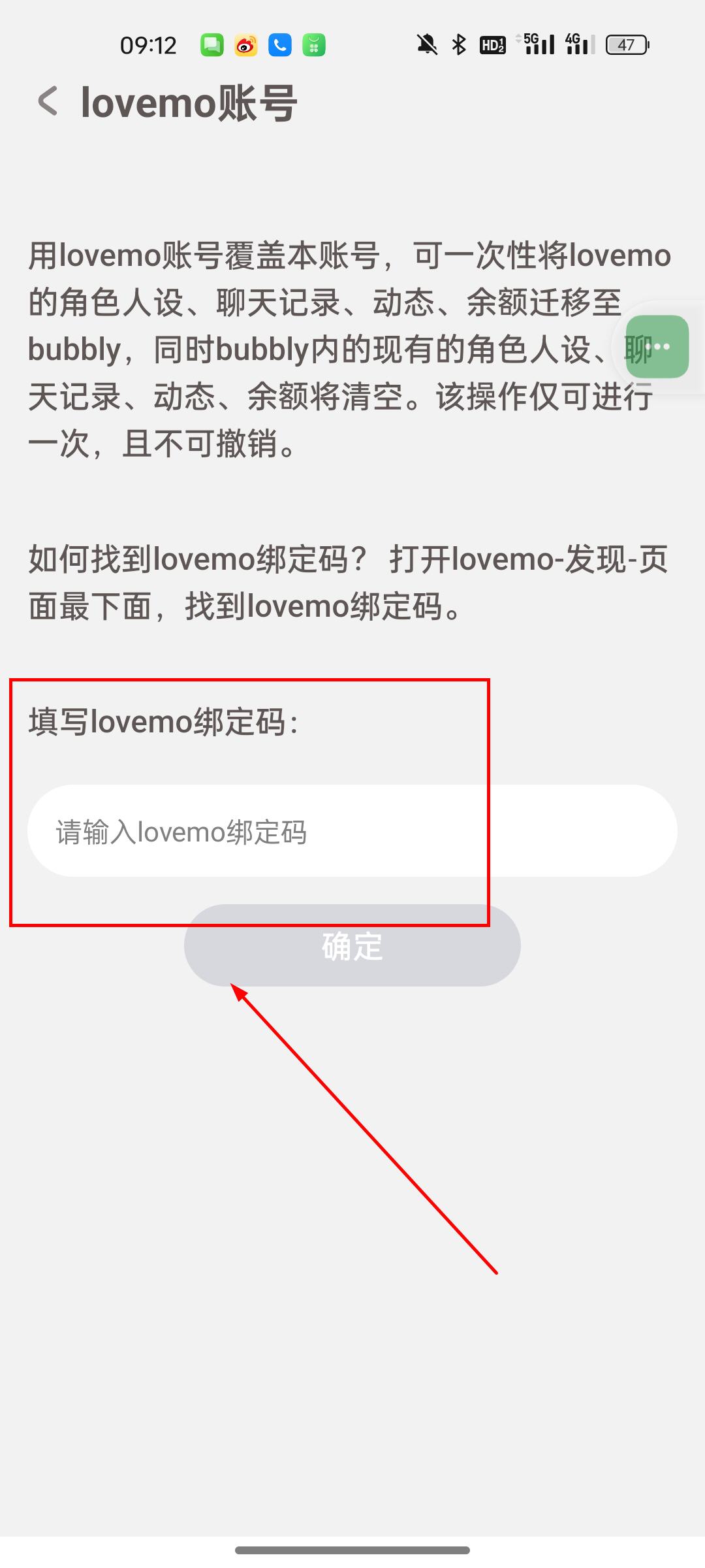 7、输入lovemo的绑定码即可完成覆盖。