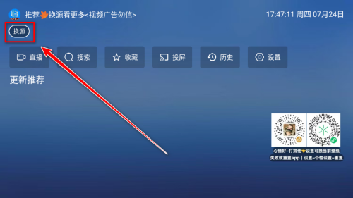 1、下载安装并打开最新版本的翠花影视,点击左上角的换源。