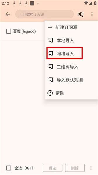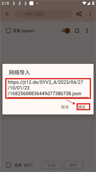 4.在本站本页面的特别说明里复制其中一条书源链接(可任意选择),将其粘贴到弹出的【网络导入】里,点击【确定】