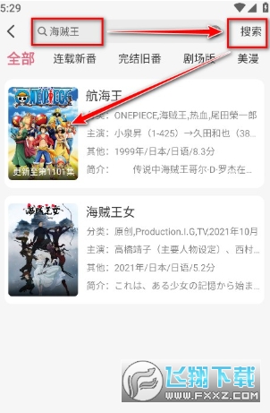 2.输入动漫名称关键字,点击搜索,再点击相匹配的动漫。在这里以海贼王为例。