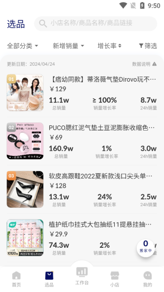 选品专区可以查看到各类商品的销量增长率,帮助用户掌握市场;