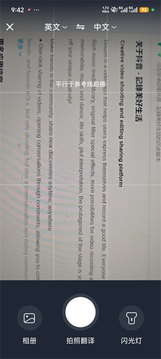 2、点击拍照翻译,上方可设置英文翻译成中文