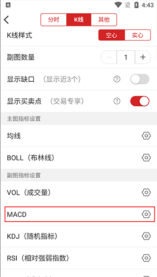 5、下拉“指标设置”页选择“MACD”齿轮按钮。