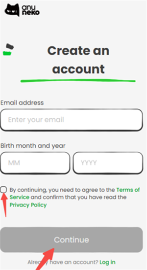 3、输入电子邮箱以及出生年月后点击底部Continue按钮