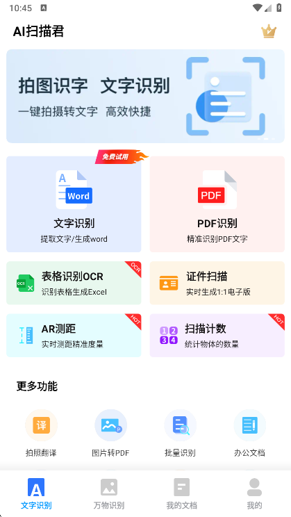 AI扫描君app官方版是一款基于AI技术的全能型文档处理工具,集OCR文字识别、多格式转换、多语言翻译、智能去水印四大核心功能于一体。无论是合同协议、书籍笔记、表格数据还是照片文字,均可通过手机摄像头一键数字化,支持中英日韩法等30+语言互译,输出Word/PDF/Excel等10余种格式。专为学生党、职场人士打造,彻底告别手动输入,让文档处理像呼吸一样简单!