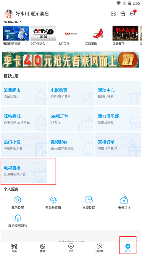 2、也可以通过【我的->精彩生活】中的电视直播实现全国电视同步看。