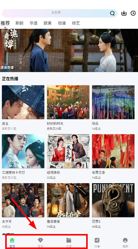 2、在首页浏览推荐的剧集,下滑可以找到更多类目的热门推荐;