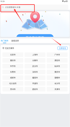 2、在城市选择页可输入名称搜索,或使用定位功能自动获取当前城市。