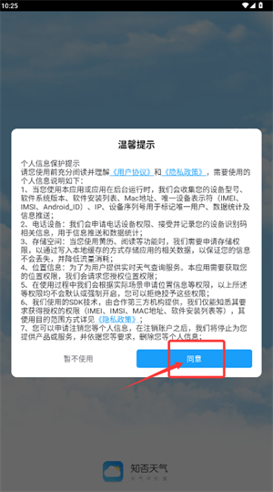 1、启动知否天气应用,阅读用户协议与隐私政策后,点击同意进入。
