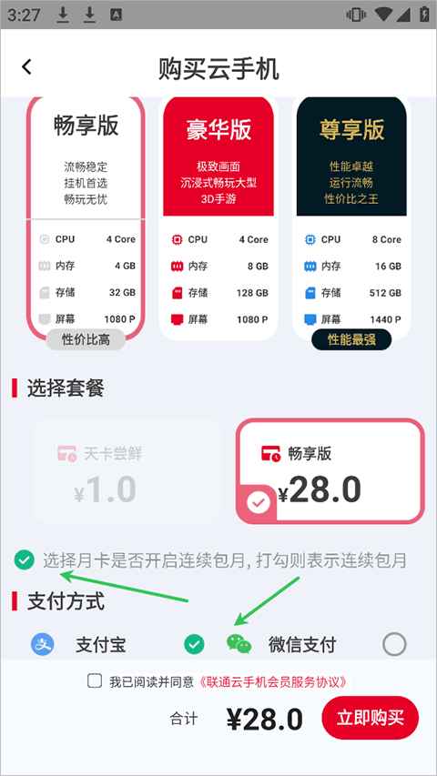 购买时可以勾选是否连续包月,支付方式有支付宝、微信支付