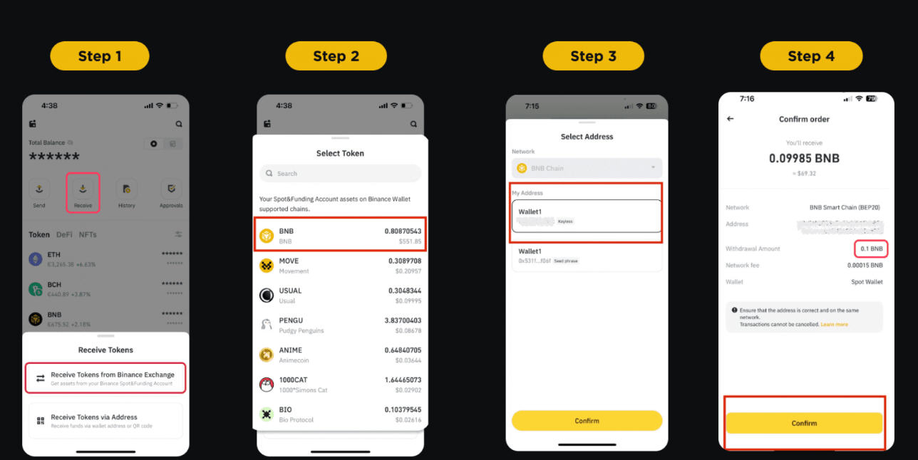 点击【接收】-【通过币安交易平台接收代币】,然后选择所需代币。