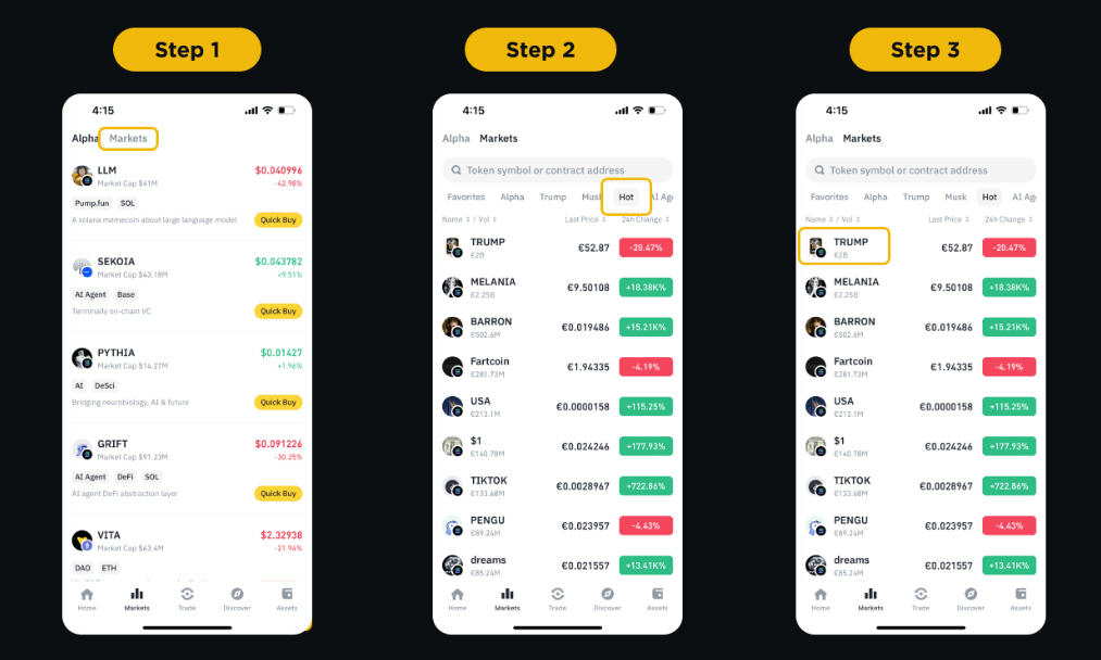 2. 在【市场】选项卡下,您将看到【热门】列表。点击要购买的任何热门代币,即可直接进入购买页面。在本教程中,我们以 TRUMP 代币为例。