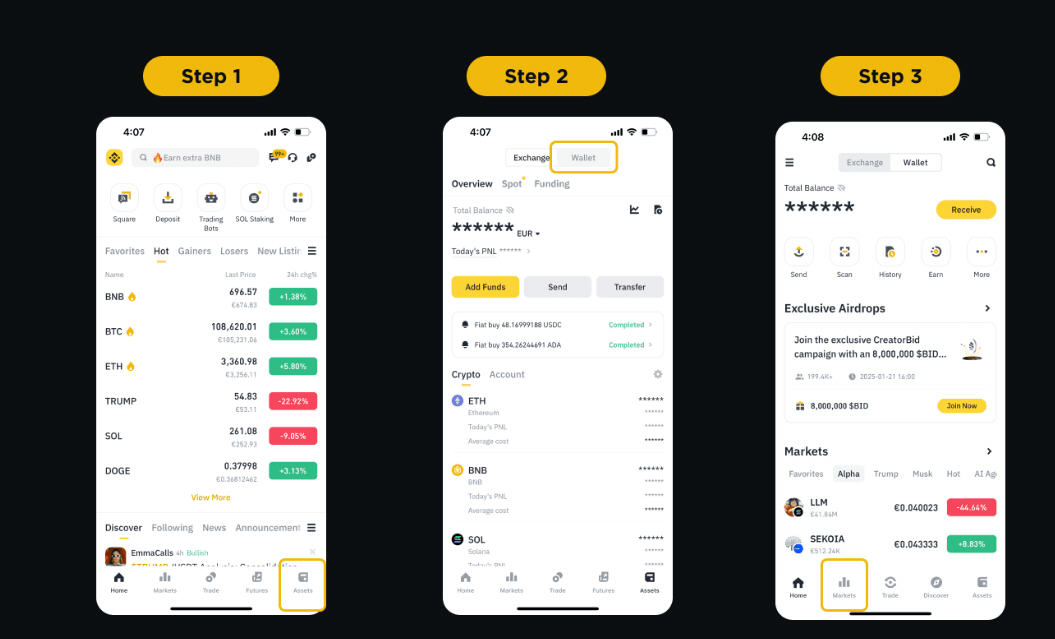 1. 登录币安账户,前往【资产】-【钱包】-【市场】。