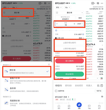 1,在 “合约” 界面选择 “限价委托” 或 “市价委托”;