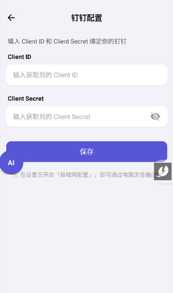 在配置设置界面中,选择 AI 大模型选项,并绑定入口应用。请根据提示填写必要的 Client ID 和 Client Secret 信息,完成入口应用的绑定。