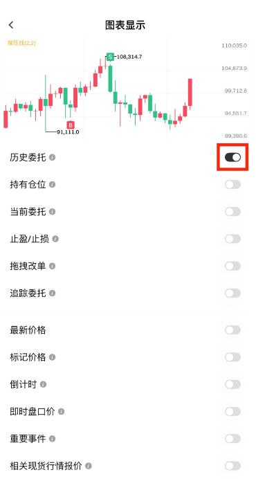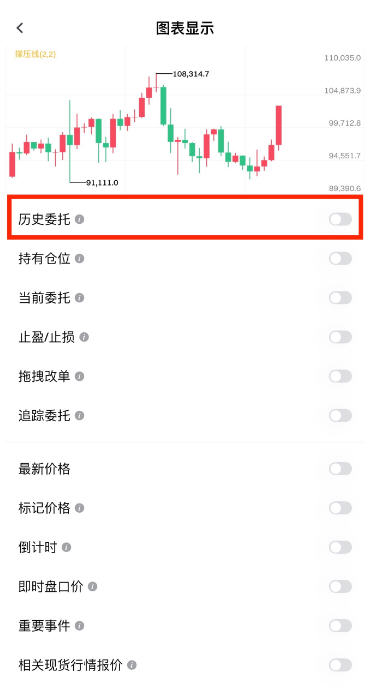 1.若您希望取消“历史委托”显示,可按照相同步骤进入【图表显示】页面,关闭“历史委托”按钮即可。