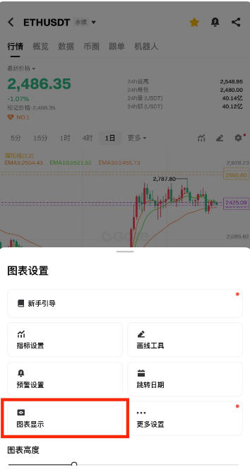 2.在 K 线图页面中,点击右上角的【图表设置】按钮,选择【图表显示】选项。