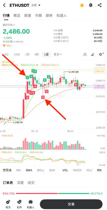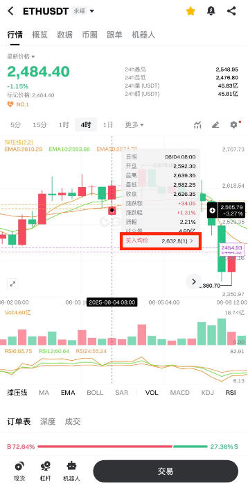 本文将以 ETH/USDT 永续合约页面为例,为您介绍如何在图表中添加或取消“历史委托”显示,帮助您更直观地查看或隐藏已成交订单的标示信息。