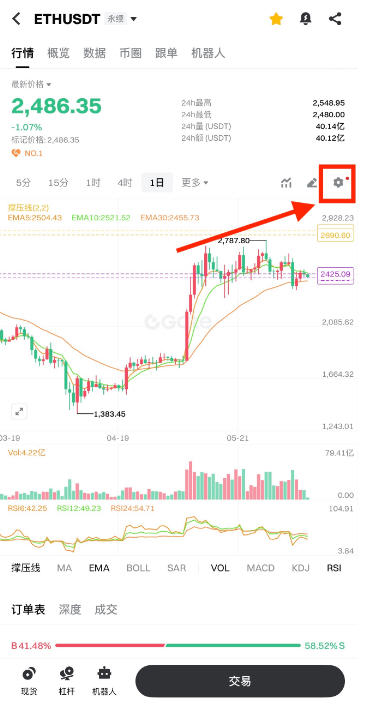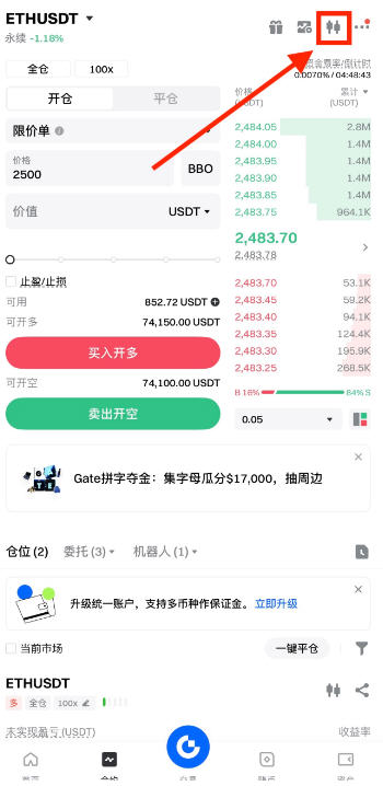 1.进入交易页面,点击右上角的蜡烛图标,进入 K线图页面。