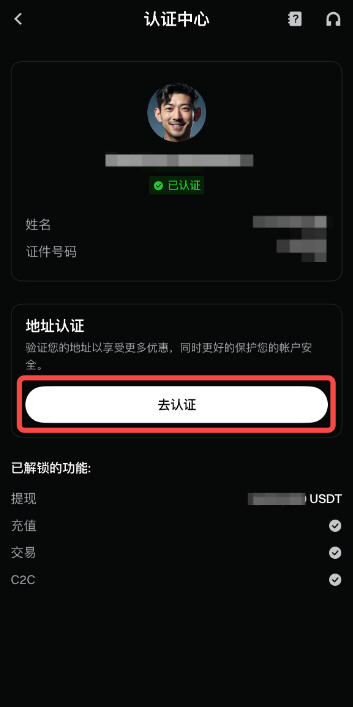 身份认证审核通过后,可以继续点击【去认证】进行地址认证。
