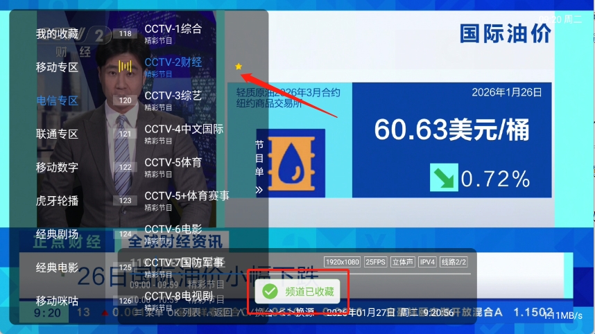 3、长按电视频道就可以进行收藏了。