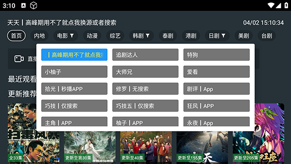 1、软件自带影视源接口配置,安装完成后即可直接使用,点击主页选项可以切换首页影视源。