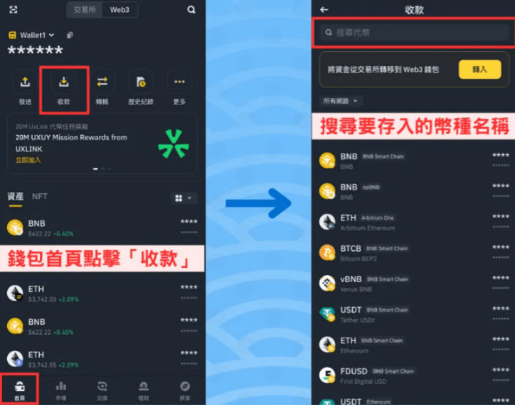 要将加密货币存进币安Web3 钱包,首先进入钱包「首页」,点击「收款」,接着搜寻你要存入的币种名称,取得存币地址。