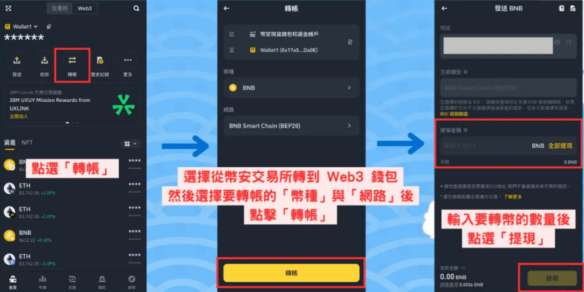此外,你也可以利用「转帐」功能,将币安交易所的资产转移到币安Web3 钱包中。