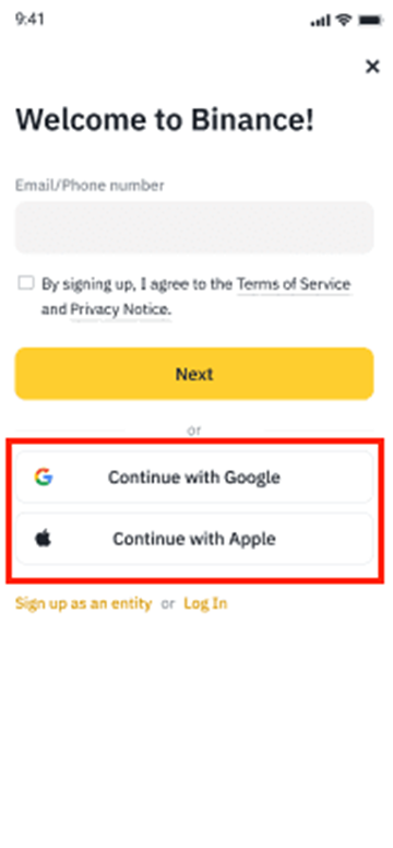 4.选择【通过Apple继续】或【通过谷歌继续】。系统会提示用Apple或谷歌账户登录币安。