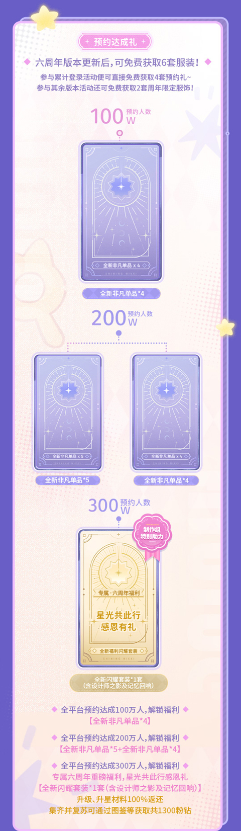 全平台预约达成300万人,解锁专属六周年重磅福利,星光共此行感恩礼【全新闪耀套装*1套(含设计师之影及记忆回响)!升级、升星材料100%返还,集齐并复苏可通过图鉴等获取共1300粉钻】