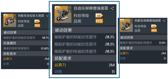 各位指挥官应该明确一点:就算你的回充量叠上去了,但是如果你没有足够的抗性,你的回充量始终只是一堆没有意义的数字。在高额的暴击伤害面前,没有抗性的护盾无异于一捅即破的纸,而你的回充量也无异于杯水车薪。因此,接下来我们要做的是想办法提高护盾抗性,让你的回充量变成货真价实的钢筋混凝土,这就要请出回盾流的最佳伴侣、被称为万金油的各种抗性增加装置/组件: